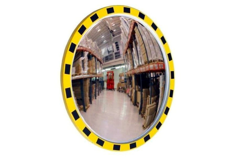 - Lustro magazynowe z żółto-czarną ramą , zgodne z dyrektywą CE 92-58. Zwierciadło lustra jest nietłukące. Lustro odporne na warunki zewnętrzne i promienie UV.
