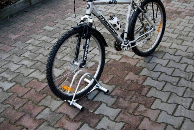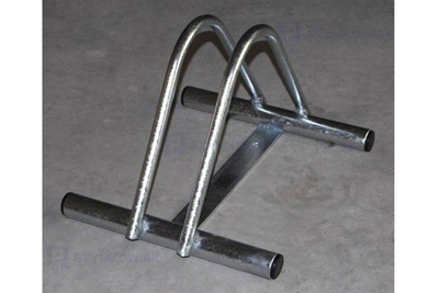 - Stalowy stojak rowerowy jednostanowiskowy, ocynkowany ogniowo.