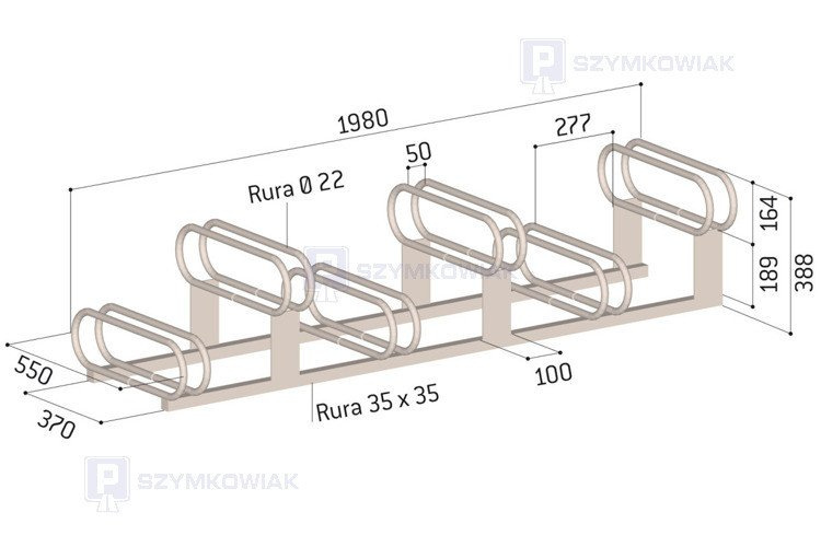 - Stojak ocynkowany ogniowo, na sześć rowerów. Dwupoziomowość stojaka pozwala na ograniczenie niezbędnego miejsca do parkowania rowerów.