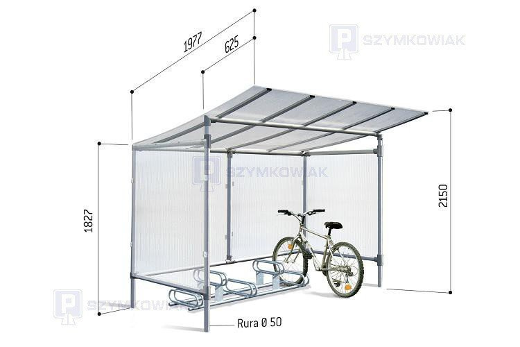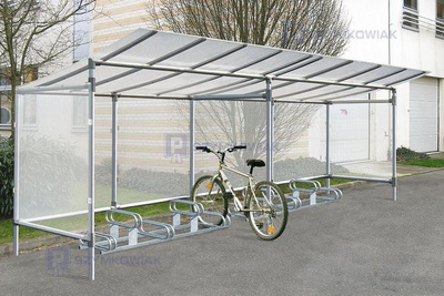- Wiata rowerowa z możliwością rozbudowania modułowego o kolejne segmenty. Konstrukcja aluminiowa z wypełnieniem z poliwęglanu.