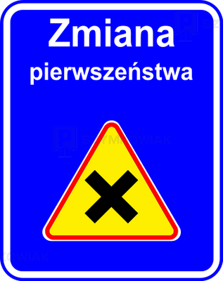 - Uprzedza o mającej nastąpić lub niedawno wprowadzonej zmianie obowiązujących dotychczas zasad pierwszeństwa na najbliższym skrzyżowaniu - zmiana pierwszeństwa z trójkątem wskazujący skrzyżowanie równorzędne