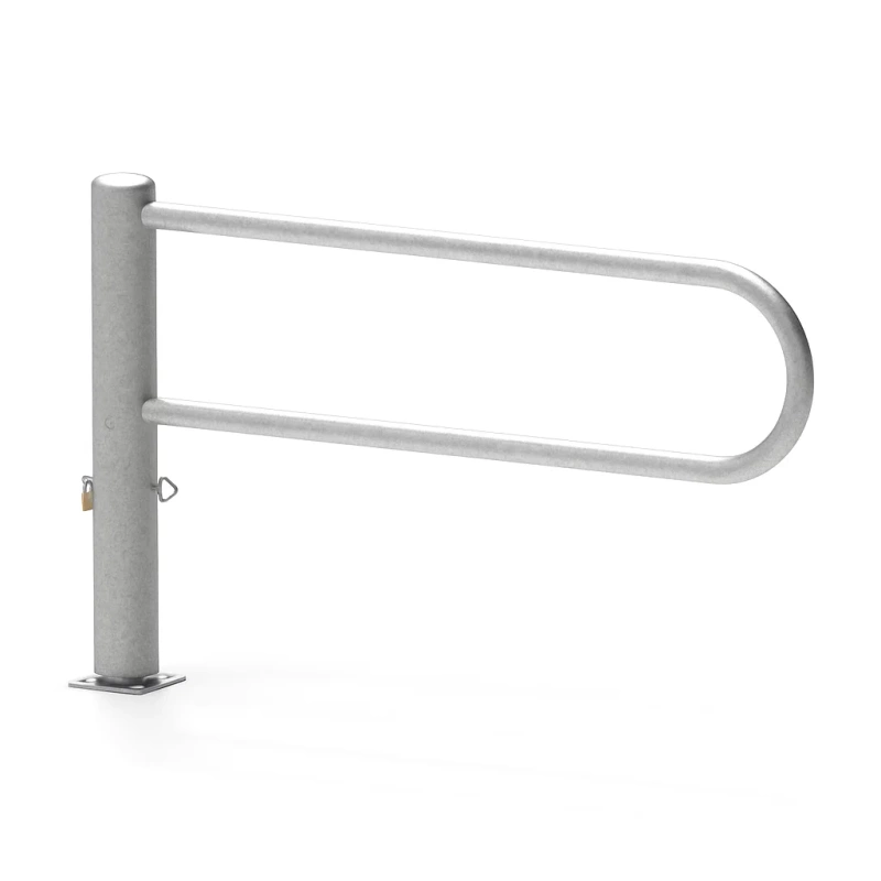 Zamknięcie wykonane jest z zawleczki Ø20 mm i kłódki (dostarczana w zestawie). Rozwiązanie to pozwala na blokowanie barierki w pozycji zamkniętej oraz otwartej pod kątem 90 stopni.
