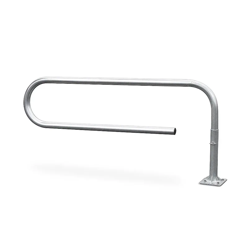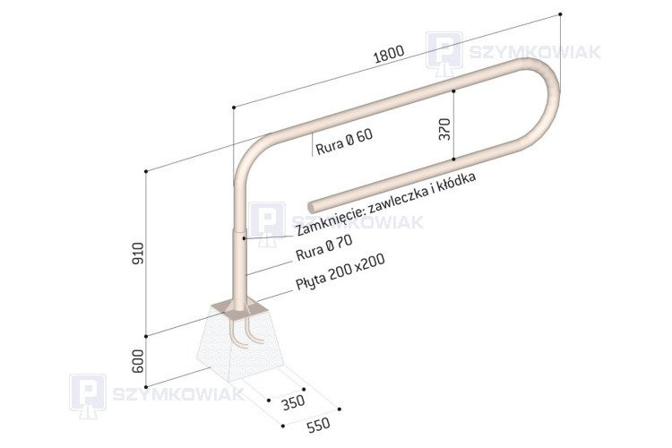 Konstrukcja bariery opiera się na pionowej rurze Ø70 mm oraz pałąku z rury Ø60 mm o grubości ścianki 2 mm. Całość osadzona jest na stalowej podstawie 200×200 mm, montowanej do nawierzchni przy pomocy kotew dostarczanych w zestawie.