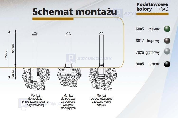 Montaż: podstawa do przykręcenia (opcje: bezpośrednie zabetonowanie w gruncie albo system ruchomy zapewniający łatwy demontaż)