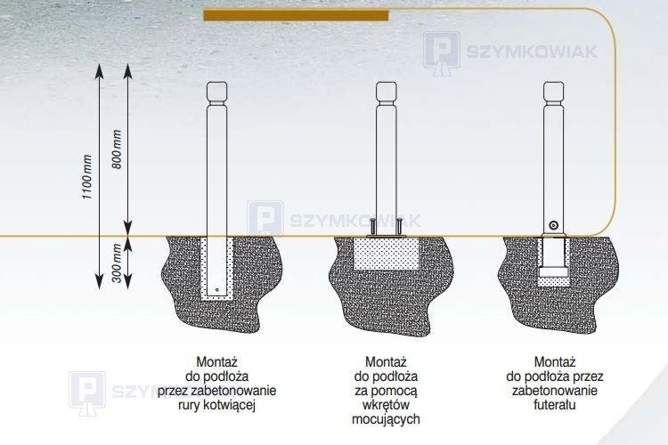 Montaż: system ruchomy zapewniający łatwy demontaż (opcje: bezpośrednie zabetonowanie w gruncie albo podstawa do przykręcenia)