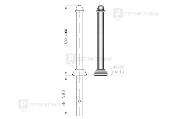 Słupek RETRO 01 wykonany jest z rur stalowych Ø76 mm (opcja: Ø60 mm) zakończonych ozdobną gałką. Słupek przygotowany jest do bezpośredniego montażu w gruncie przez zabetonowanie.