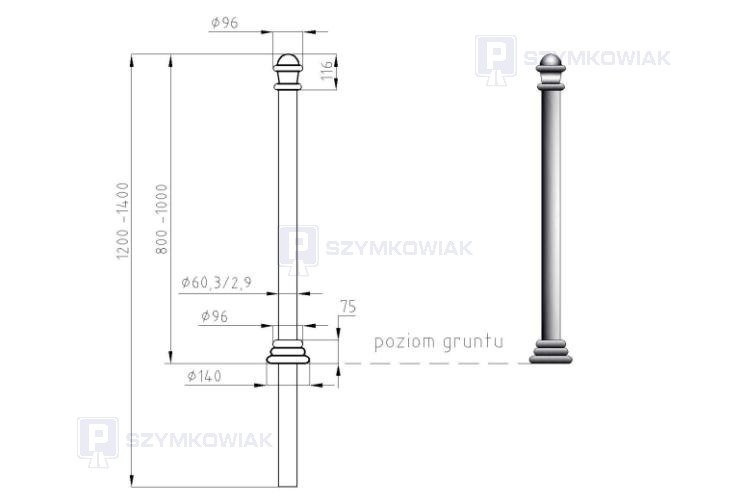 Słupek RETRO 03 wykonany jest z rur stalowych Ø60 mm (opcja: Ø76 mm) zakończonych ozdobną gałką. Słupek przygotowany jest do bezpośredniego montażu w gruncie przez zabetonowanie.