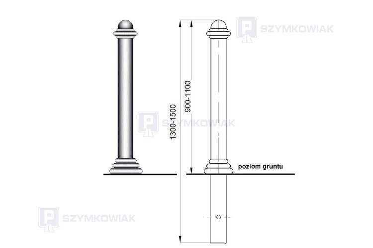 Słupek RETRO 04 wykonany jest z rur stalowych Ø76 mm zakończonych ozdobną gałką. Słupek przygotowany jest do bezpośredniego montażu w gruncie przez zabetonowanie.