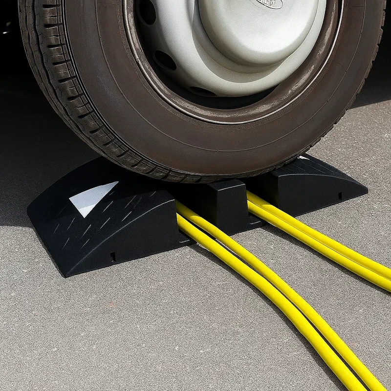 - Próg kablowy DN600 z litej gumy, z 2 kanałami 75x80 mm i nośnością do 40 ton/oś. Wyposażony w elementy odblaskowe, chroni przewody w ruchu pieszym i samochodowym. Idealny do hal, placów i wydarzeń masowych.