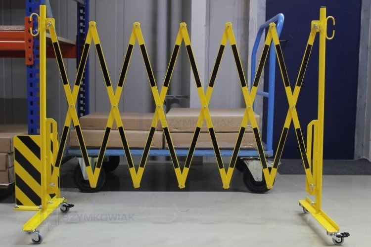 - Zapora nożycowa do wygradzania przejść w magazynie, wygradzania robót. Barierka jest w pełni mobilna dzięki dolnym kółkom, które zapewniają łatwe przestawienie wygrodzenia.