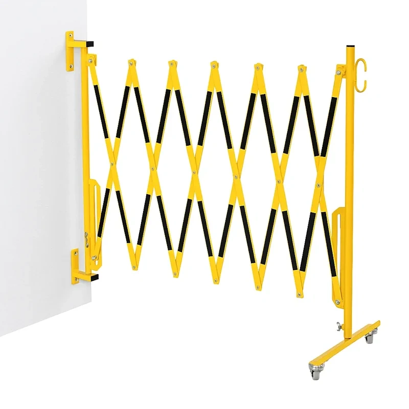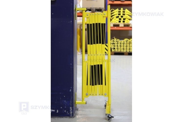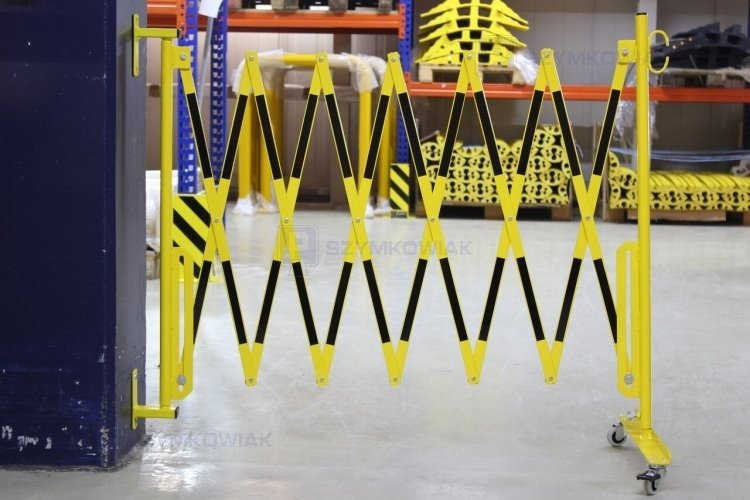 - Zapora nożycowa do wygradzania przejść w magazynie. Barierka posiada mocowanie do ściany, a drugi koniec przestawny na kółkach.