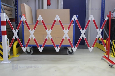 - Zapora nożycowa do wygradzania przejść w magazynie. Barierka posiada podstawę, którą można przymocować do posadzki.