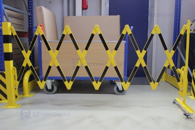 • Zapora nożycowa do wygradzania przejść w magazynie. Barierka posiada podstawę, którą można przymocować do posadzki.