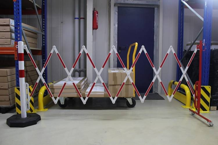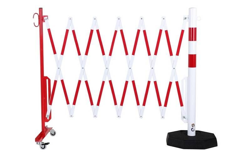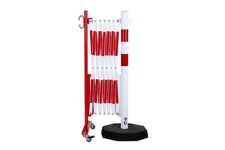 - Mobilna zapora nożycowa do tymczasowego odgradzania niebezpiecznych miejsc, np. otwartych studzienek kanalizacyjnych, wygradzania przejść. Barierka posiada stabilną, ciężką podstawę, co ułatwia użytkowanie jako tymczasowe wygrodzenie.