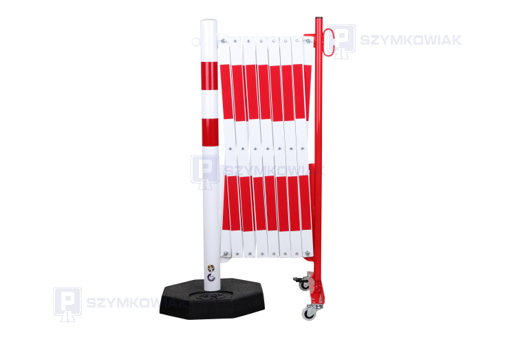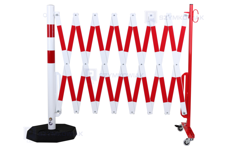 • Mobilna zapora nożycowa do tymczasowego odgradzania niebezpiecznych miejsc, np. otwartych studzienek kanalizacyjnych, wygradzania przejść. Barierka posiada stabilną, ciężką podstawę, co ułatwia użytkowanie jako tymczasowe wygrodzenie.