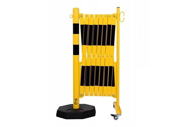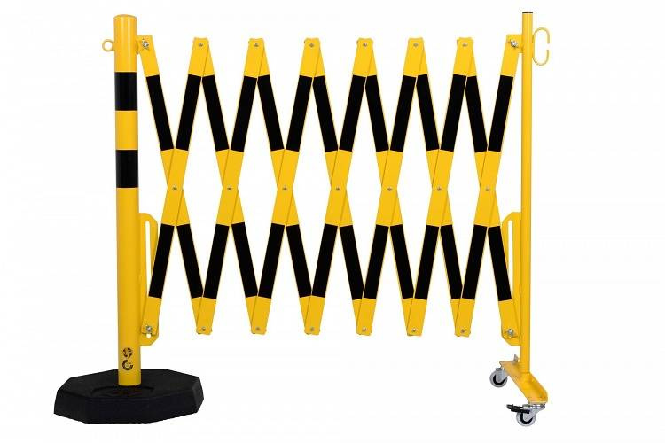 - Mobilna zapora nożycowa 360 cm, do tymczasowego odgradzania niebezpiecznych miejsc, np. otwartych studzienek kanalizacyjnych, wygradzania przejść. Barierka posiada stabilną, ciężką podstawę, co ułatwia użytkowanie jako tymczasowe wygrodzenie.