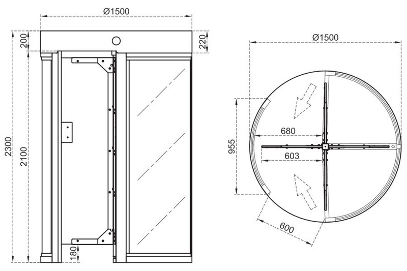 - Śluza bezpieczna z rotorem z czterema skrzydłami co 90 st. wykonanych ze szkła laminowanego. Wersja do instalacji na zewnątrz.