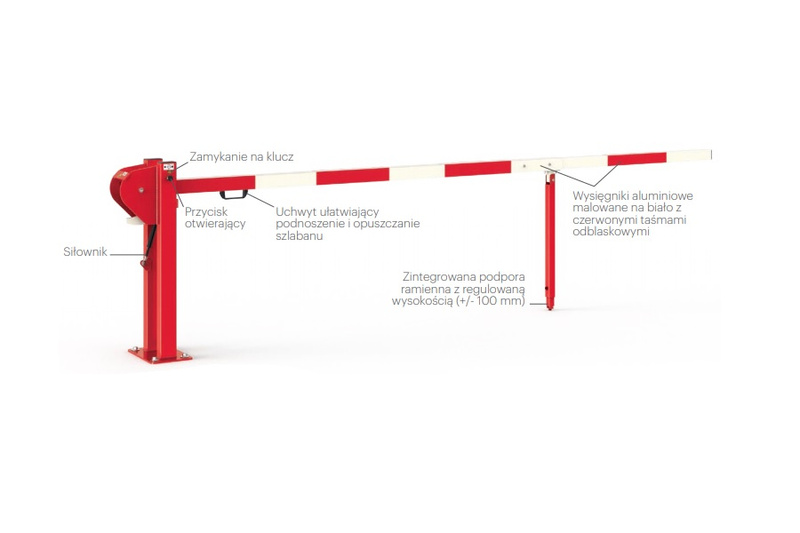 Ramię szlabanu podnosi się przy pomocy sprężyny gazowej i blokuje samoczynnie w pozycji pionowej po przekręceniu klucza w zamku szlabanu. Elementem częściowego wyważenia ramienia jest sprężyna gazowa. Ręczne opuszczenie ramienia do pozycji poziomej powoduje zaskoczenie zapadki. W tym momencie należy zablokować szlaban przekręcając kluczyk. Ramię posiada uchwyt ułatwiający podnoszenie i opuszczanie ramienia.