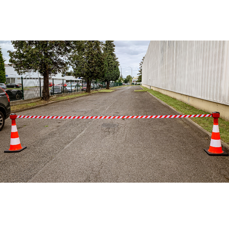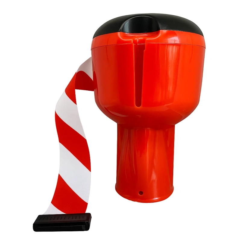 Głowica na pachołek z taśmą zwijaną to praktyczne rozwiązanie do mobilnego wygrodzenia przestrzeni użytkowych i tworzenia dowolnych konfiguracji ciągów zabezpieczających. Montowana jest bezpośrednio na pachołkach drogowych o wysokości minimum 75 cm, co zapewnia stabilność całego zestawu. Dzięki cięższej podstawie pachołka bariera pozostaje stabilna nawet przy pełnym rozciągnięciu taśmy.