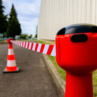 - Głowica na pachołek z taśmą 9 m – szybkie i mobilne wygrodzenie. Biało-czerwona taśma o długości 9 m, montaż bezpośrednio na pachołkach (min. 75 cm). Idealna do zabezpieczania stref i ciągów komunikacyjnych.