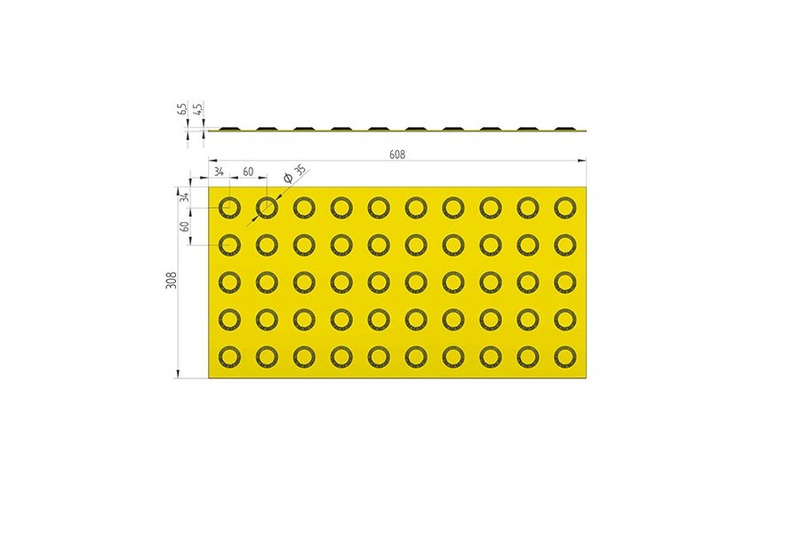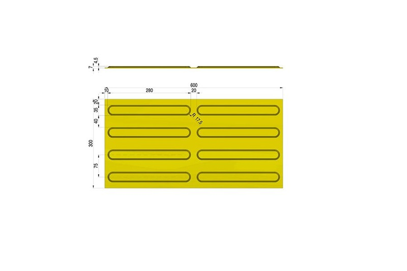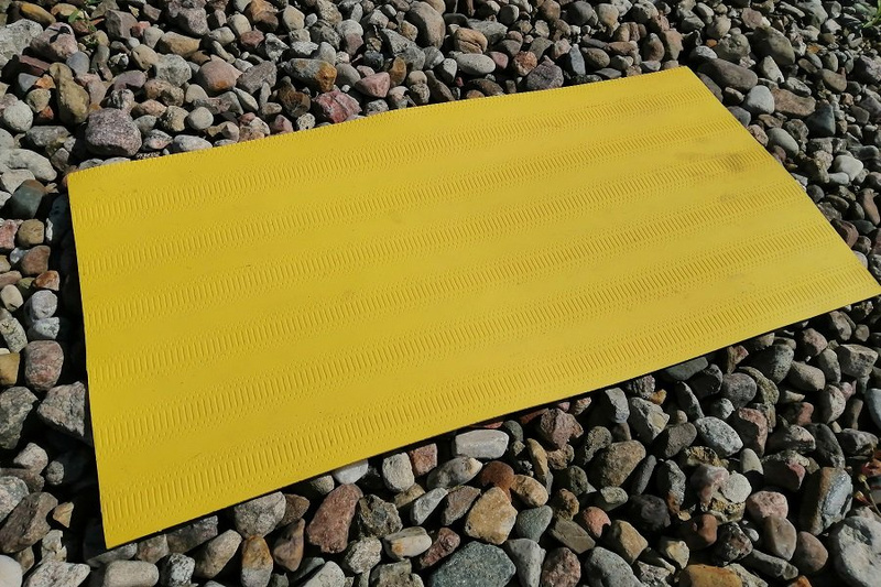 - Płyta BRAJL z wypustkami podłużnymi z wulkanizowanej gumy w kolorze żółtym. Trwała, antypoślizgowa, odporna na ścieranie, mróz i sól drogową. Dedykowana do oznakowania przestrzeni publicznych dla osób niewidomych.