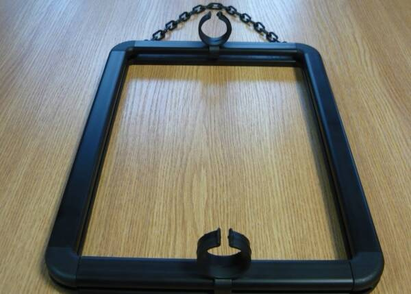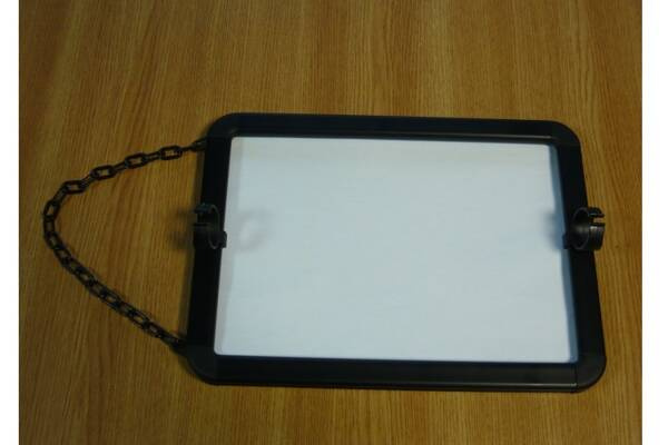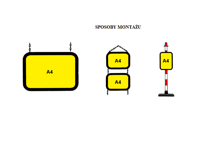 Ramka tworzywowa dostosowana do mocowania na słupkach przestawnych oraz wszelkich słupkach o średnicy 4 cm. Ramka mieści format A4. Posiada uchwyty do mocowania na słupki i łańcuszek pozwalający na zawieszenie w dowolnym miejscu.