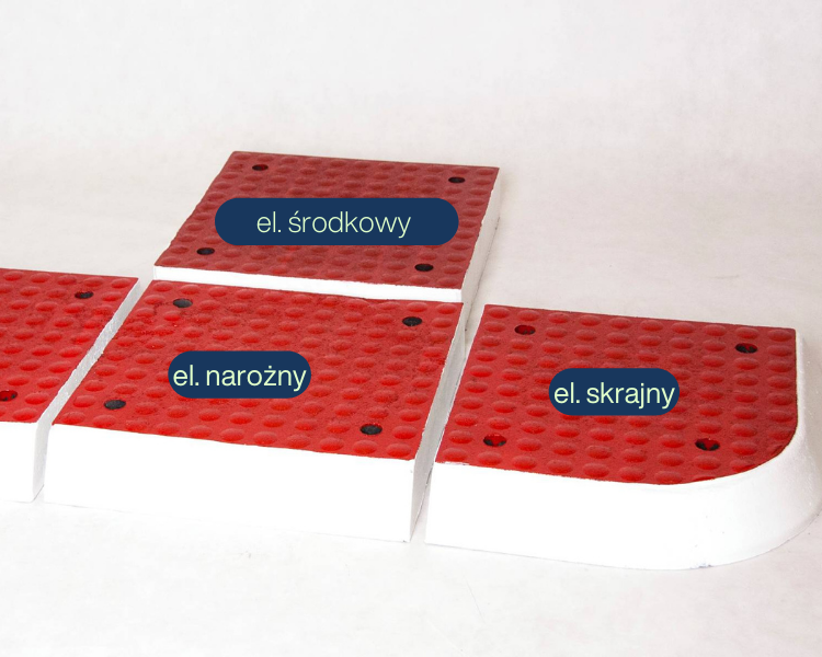 • Elementy narożne w połączeniu z elementami skrajnymi i wewnętrznymi tworzą sztuczne wysepki w celu poprawienia bezpieczeństwa pieszych uczestników ruchu.