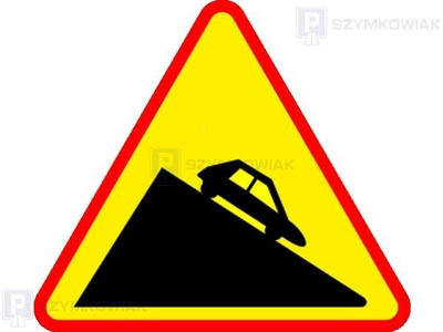 - Znak ostrzega przed znacznym spadkiem podłużnym drogi, co najmniej 10% w terenie górskim, a na pozostałych drogach co najmniej 7%, bądź gdy zjazd jest niebezpieczny ze względu na ostre zakręty lub zły stan nawierzchni.