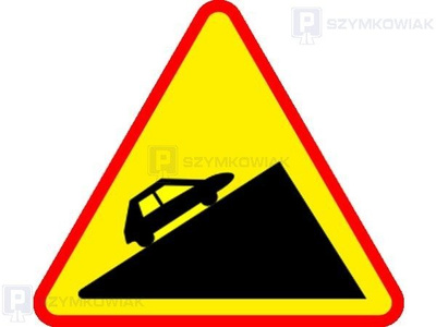- Znak ostrzega przed znacznym wzniesieniem drogi, co najmniej 8% w terenie górskim, a na pozostałych drogach co najmniej 6%, bądź gdy wjazd na wzniesienie jest utrudniony ze względu na ostre zakręty lub zły stan nawierzchni.
