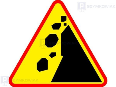 - Znak ostrzega przed miejscem, w którym na drogę mogą staczać się lub zalegać na niej odłamki skalne, stanowiące niebezpieczeństwo dla nadjeżdżających pojazdów.