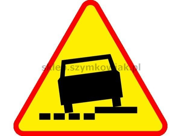 - Znak ostrzega przed niebezpiecznym poboczem (wąskim, miękkim, zbyt wysokim lub obniżonym) lub końcem pobocza bitumicznego przechodzącego w ziemne.